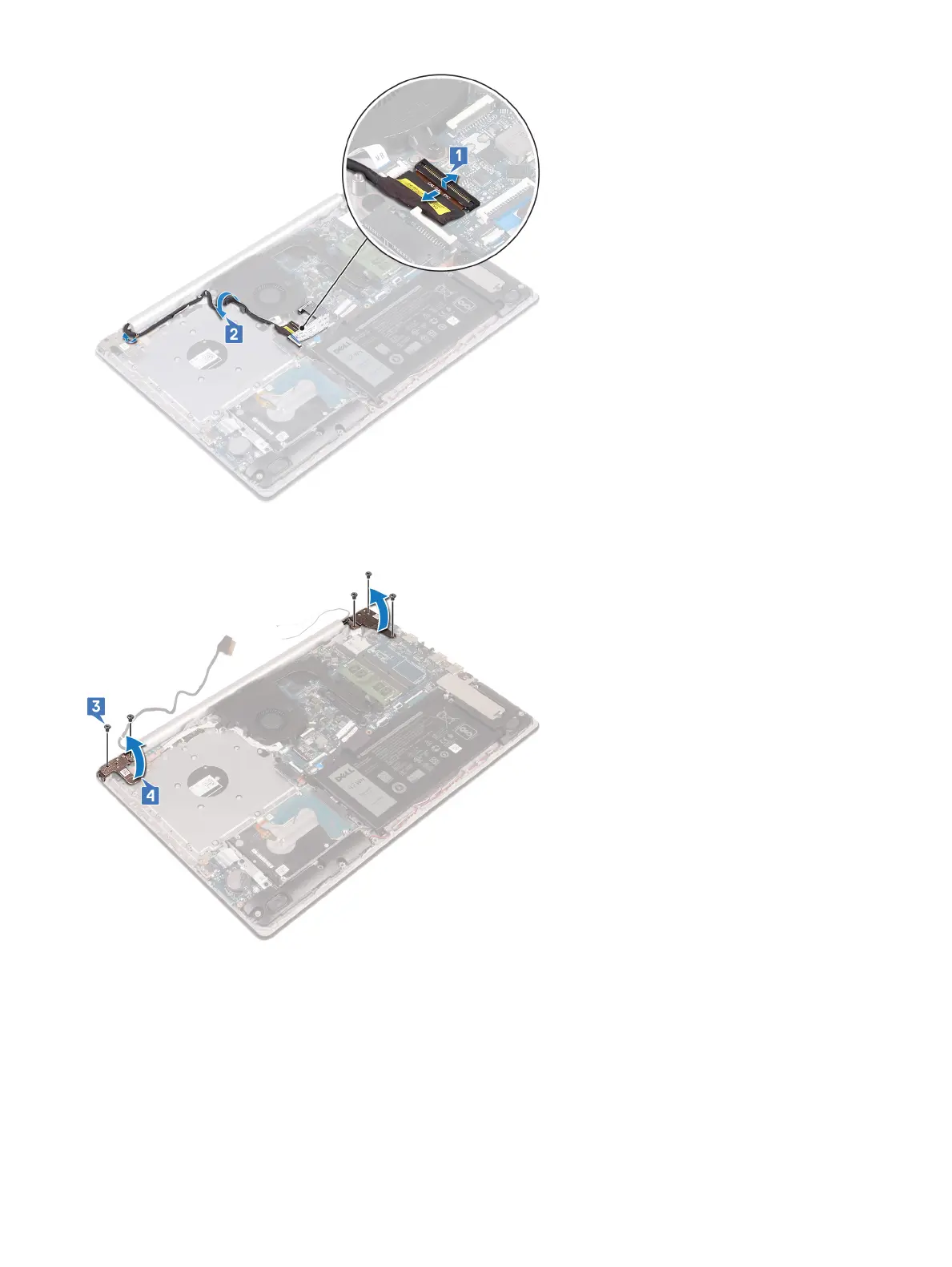 3 Remove the six screws (M2.5x5) that secure the left and right hinges to the system board and palm rest and keyboard assembly.