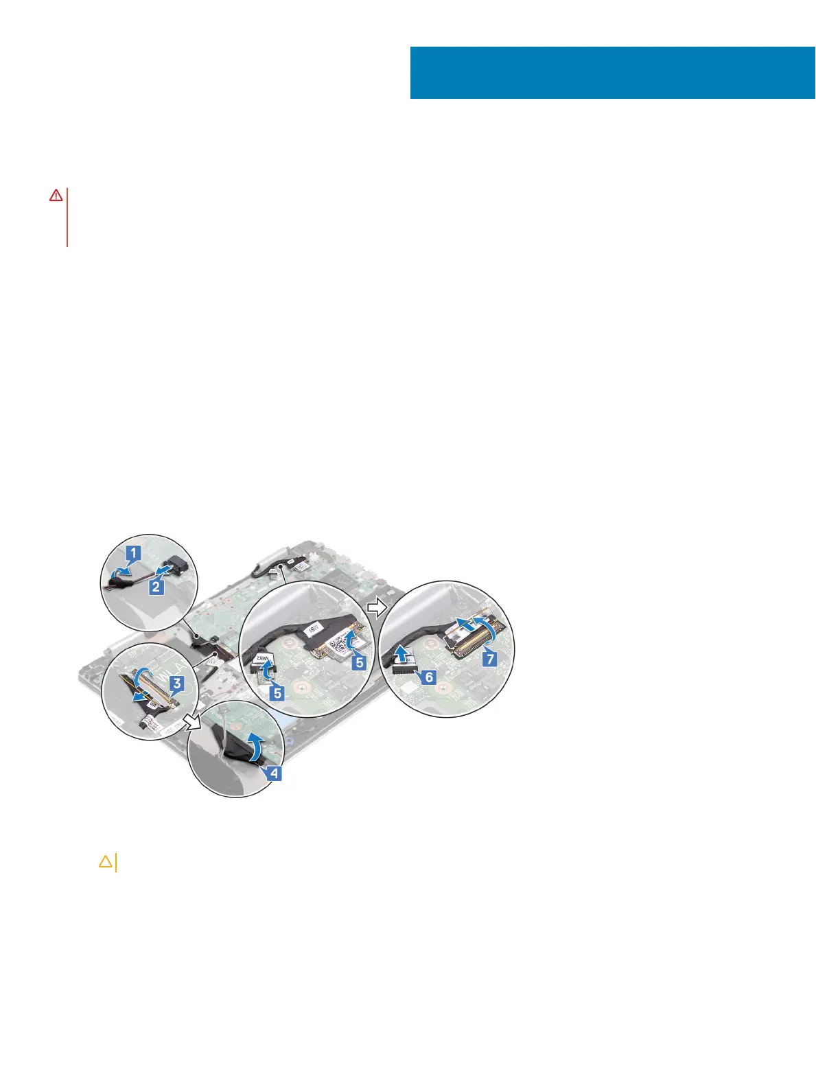 5 Peel o the tape that secures the touchscreen cable and the display cable to their respective connectors on the system board.