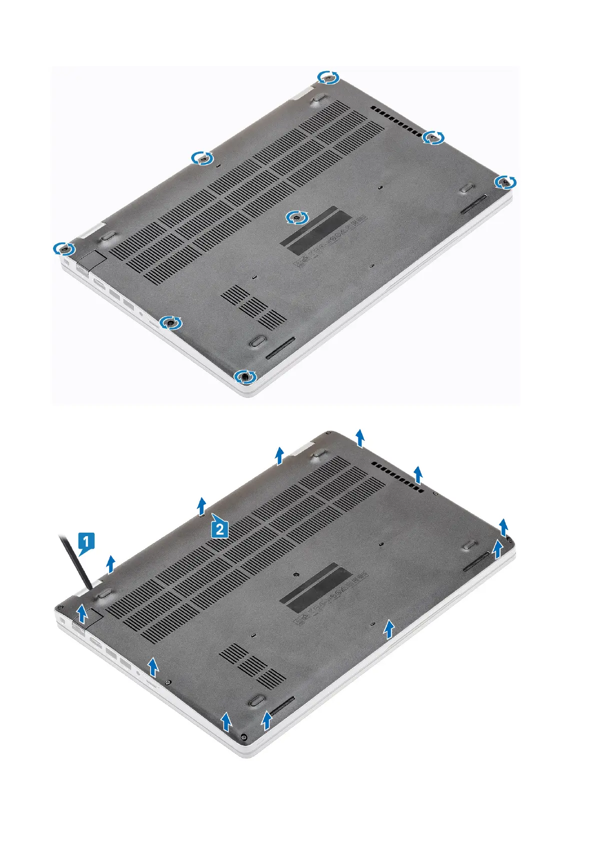 4. Using a plastic scribe [1], pry the base cover from the top-left corner and continue to work on the sides to open the base cover [2].