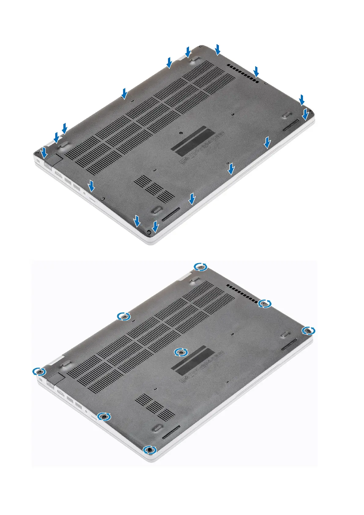 3. Tighten the eight captive screws to secure the base cover to the computer.