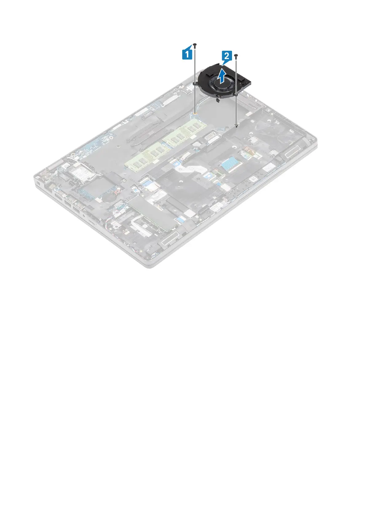 2. Replace the two (M2x5) screws to secure the system fan to the palmrest [2].