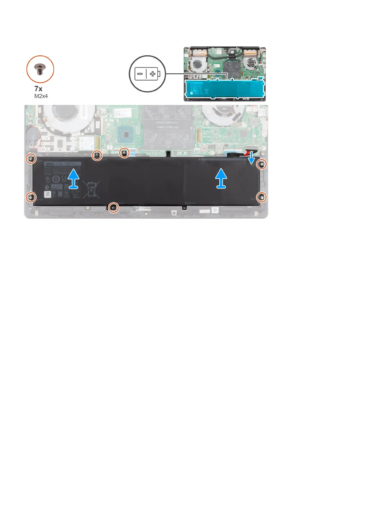 2. Remove the seven screws (M2x4) that secure the battery to the palm-rest and keyboard assembly.
