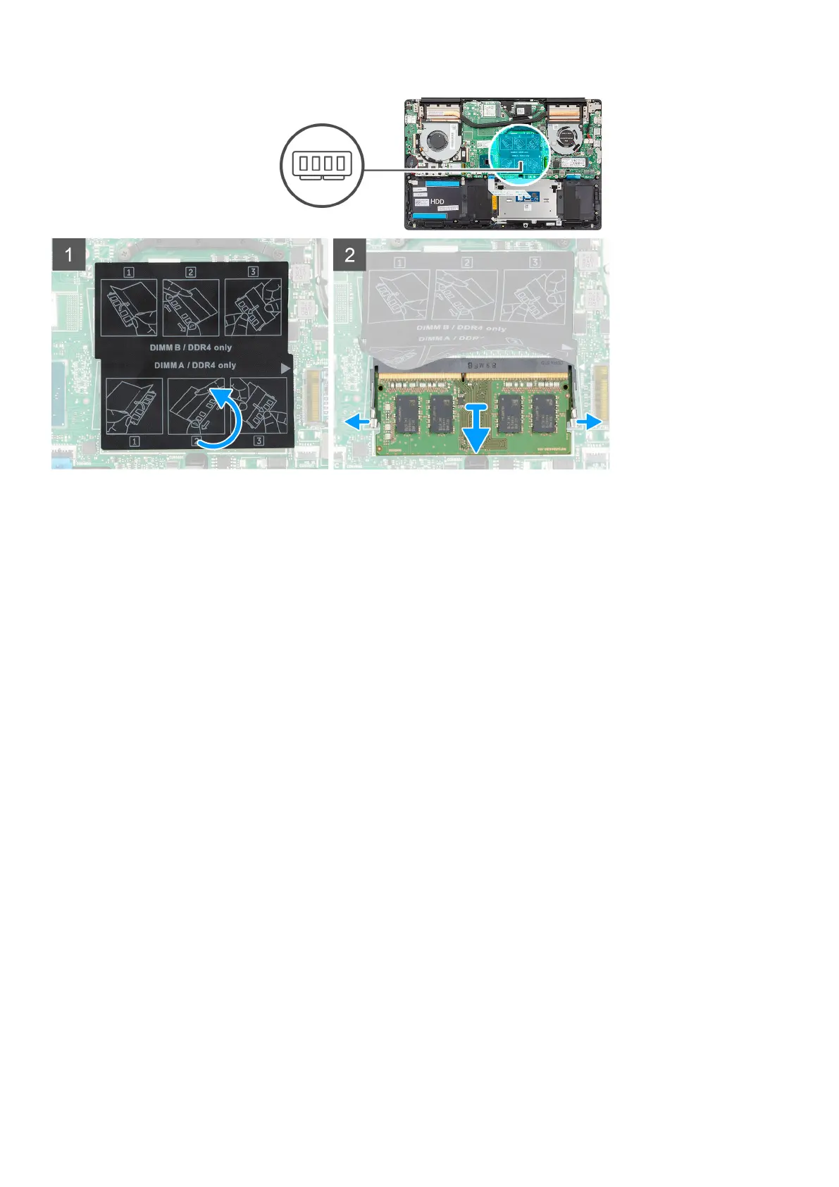 The figure indicates the location of the memory module and provides a visual representation of the installation procedure.