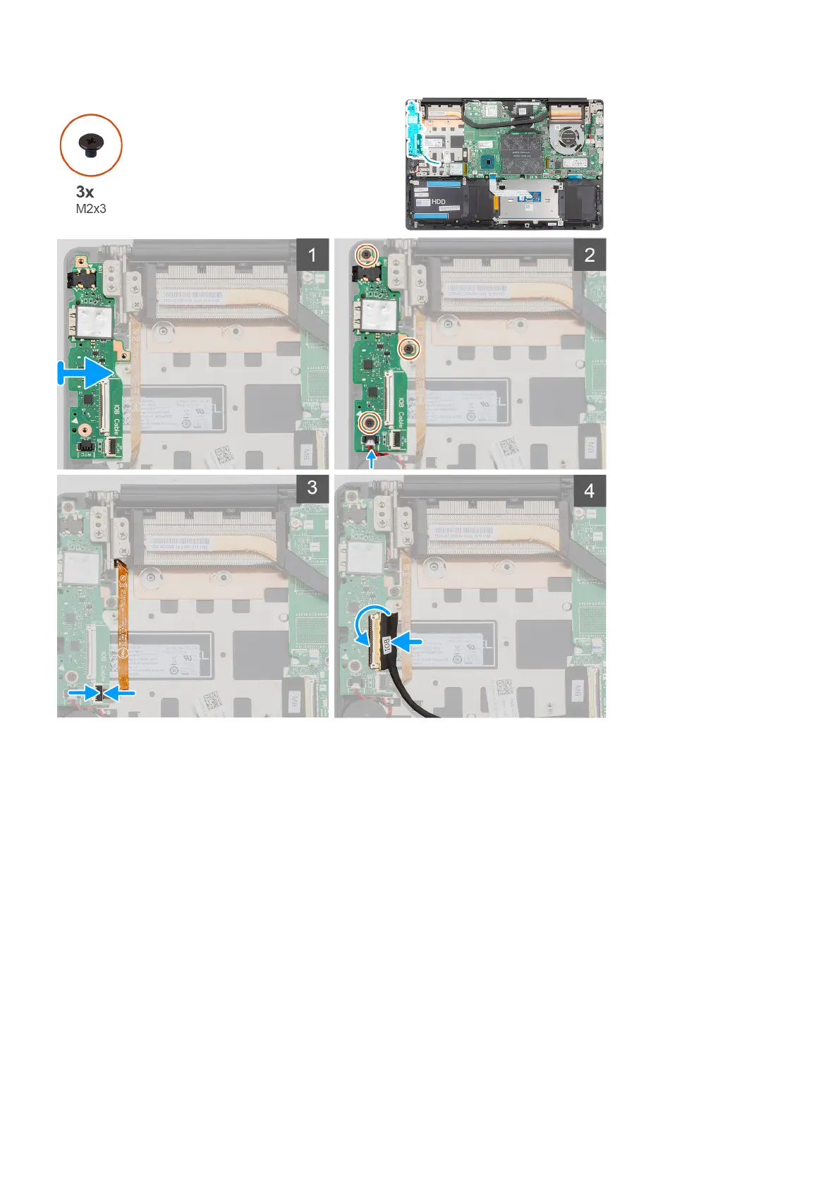 3. Replace the three screws (M2x3) that secure the I/O board to the palm-rest and keyboard assembly.