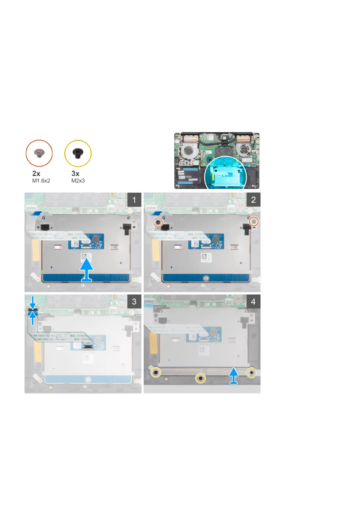 5. Replace the three (M2x3) screws that secure the touchpad bracket to the palm-rest and keyboard assembly.