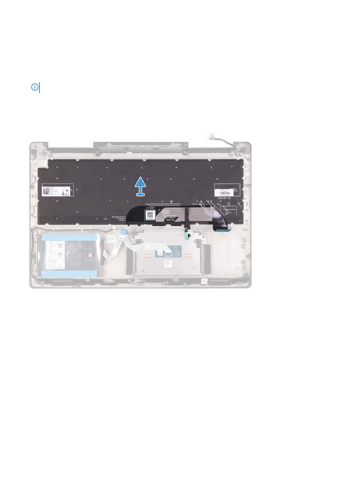 After performing the steps in the pre-requisites, lift the keyboard, along with the cables, off the palm-rest assembly.