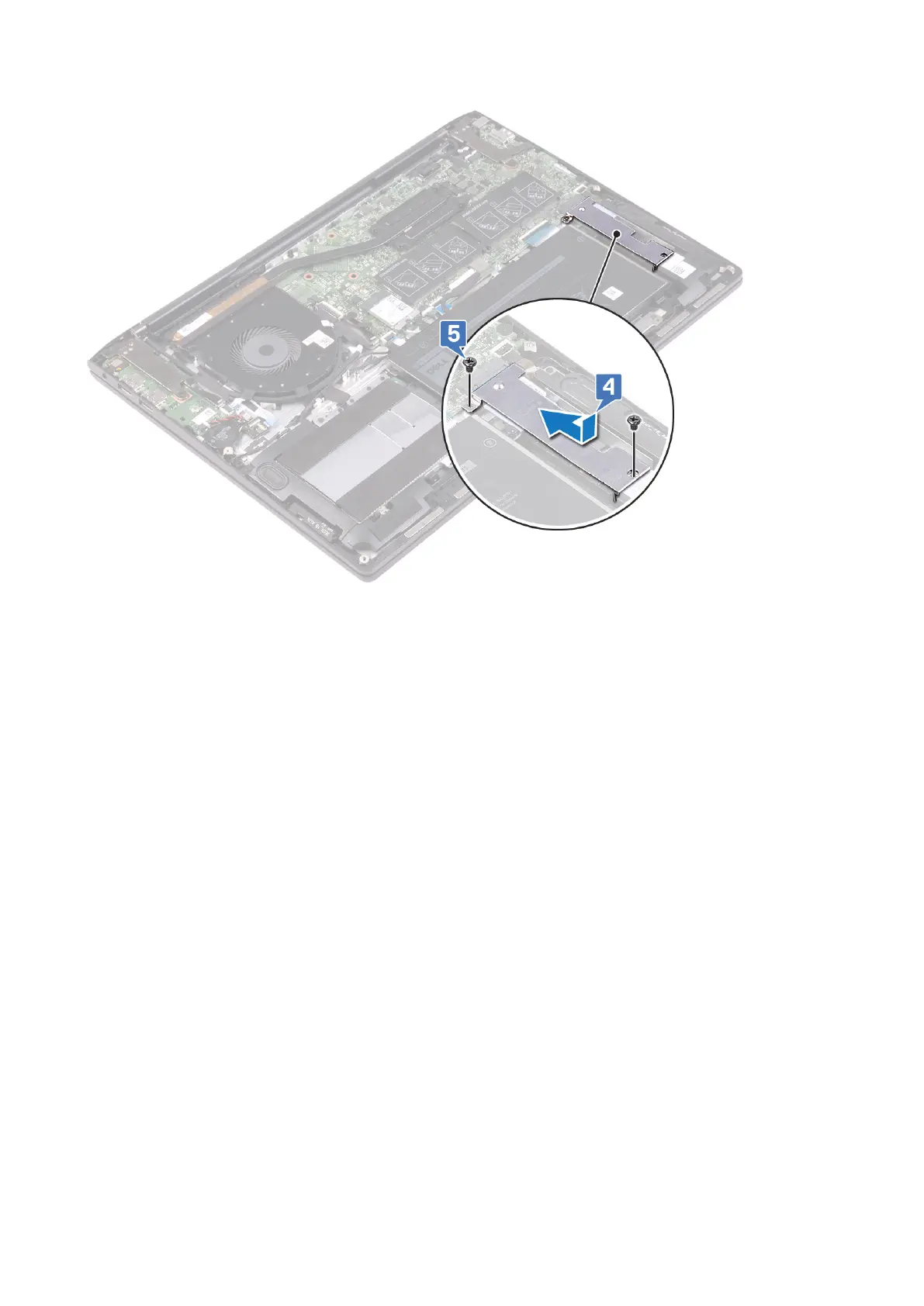 4. Replace the two screws (M2x3) that secure the solid-state drive/Intel Optane storage module shield to the palm-rest
