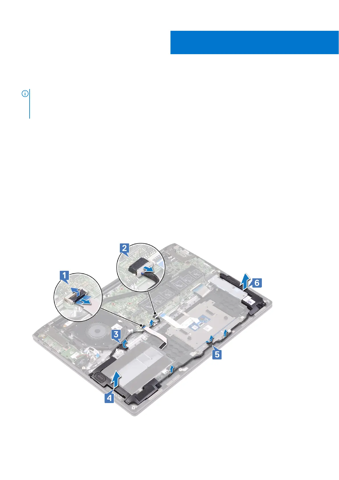 5. Peel off the tapes and remove the speaker cable from the routing guides on the palm-rest assembly.