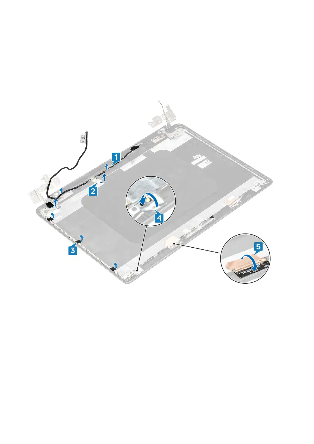 1. Remove the camera cable and the display cable from the routing guides on the display back-cover [1,2].