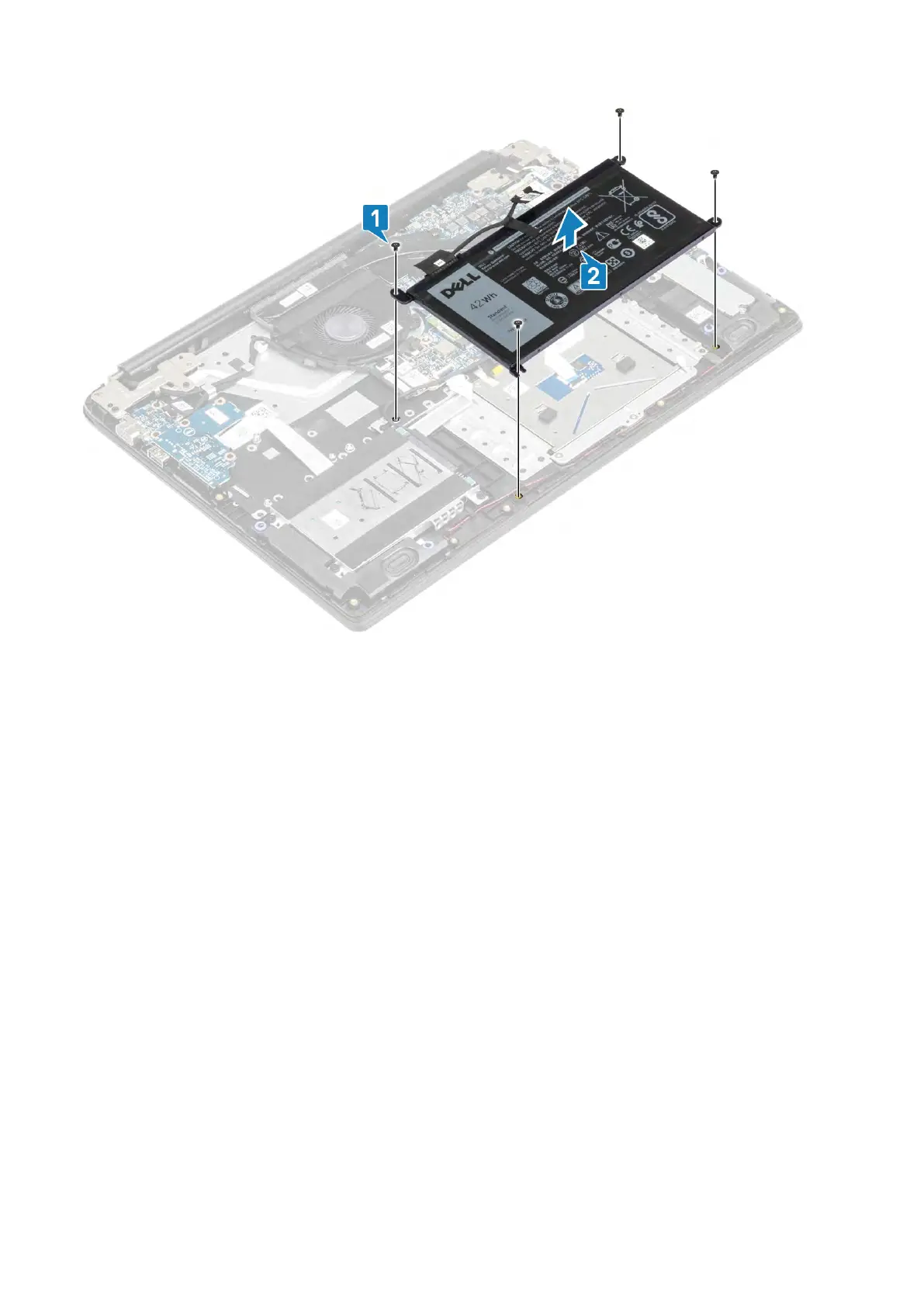 2. Replace the four (M2x3) screws that secure the battery to the palmrest and keyboard assembly [2].