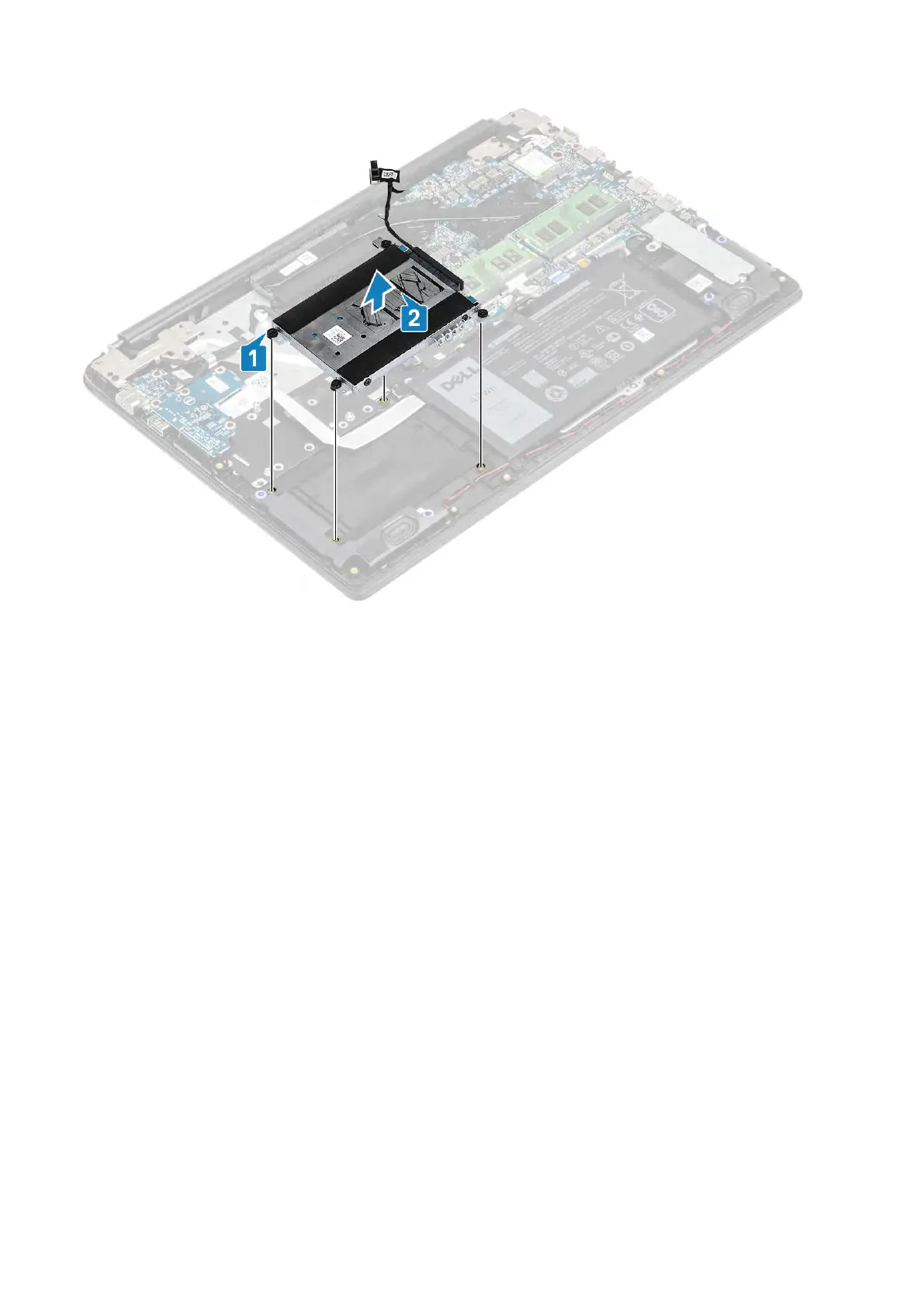 2. Replace the four (M2x4) screws that secure the hard drive assembly to the palm rest and keyboard assembly [2].