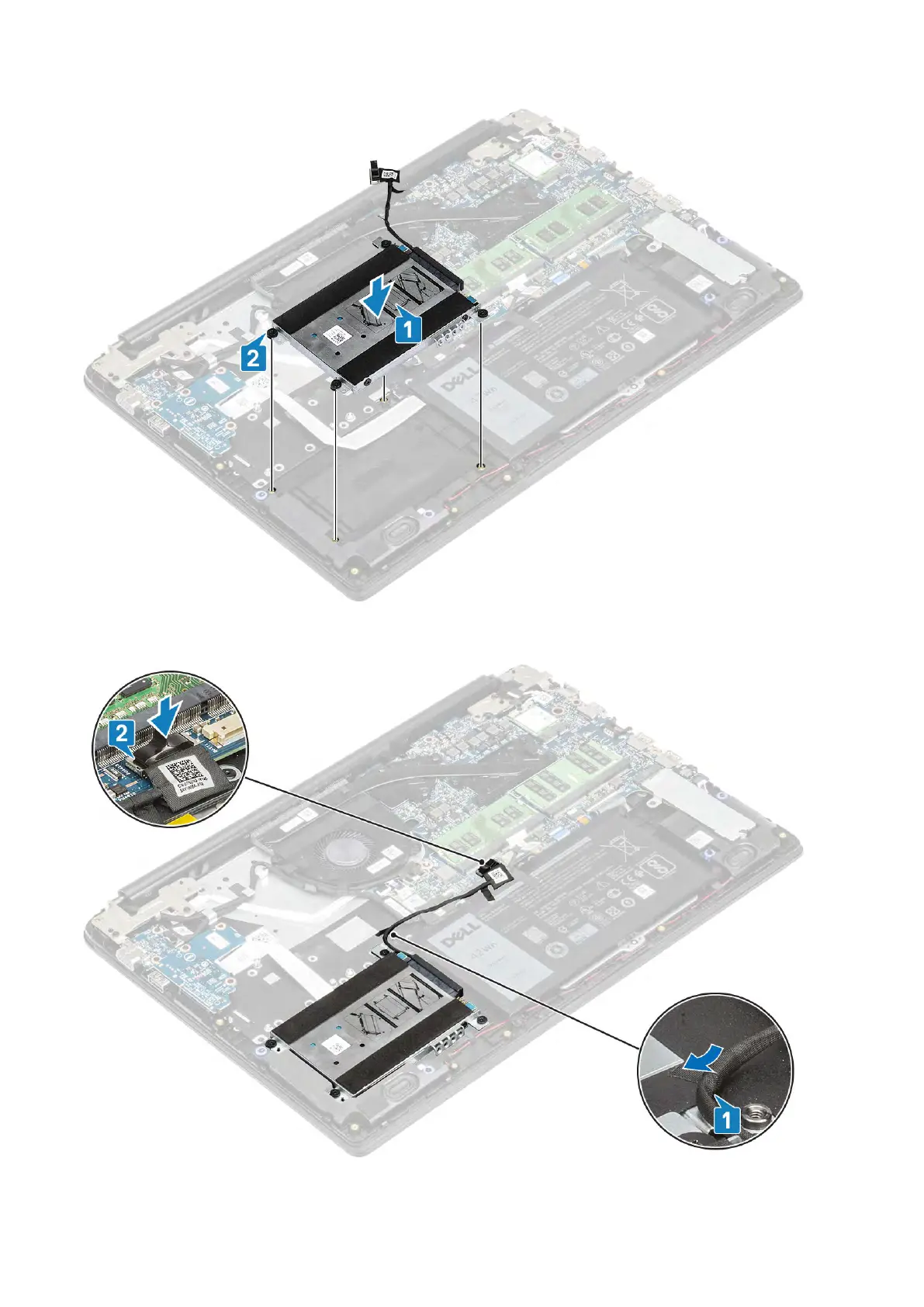 3. Adhere the tape that secures the hard drive cable to the palmrest and keyboard assembly [1].