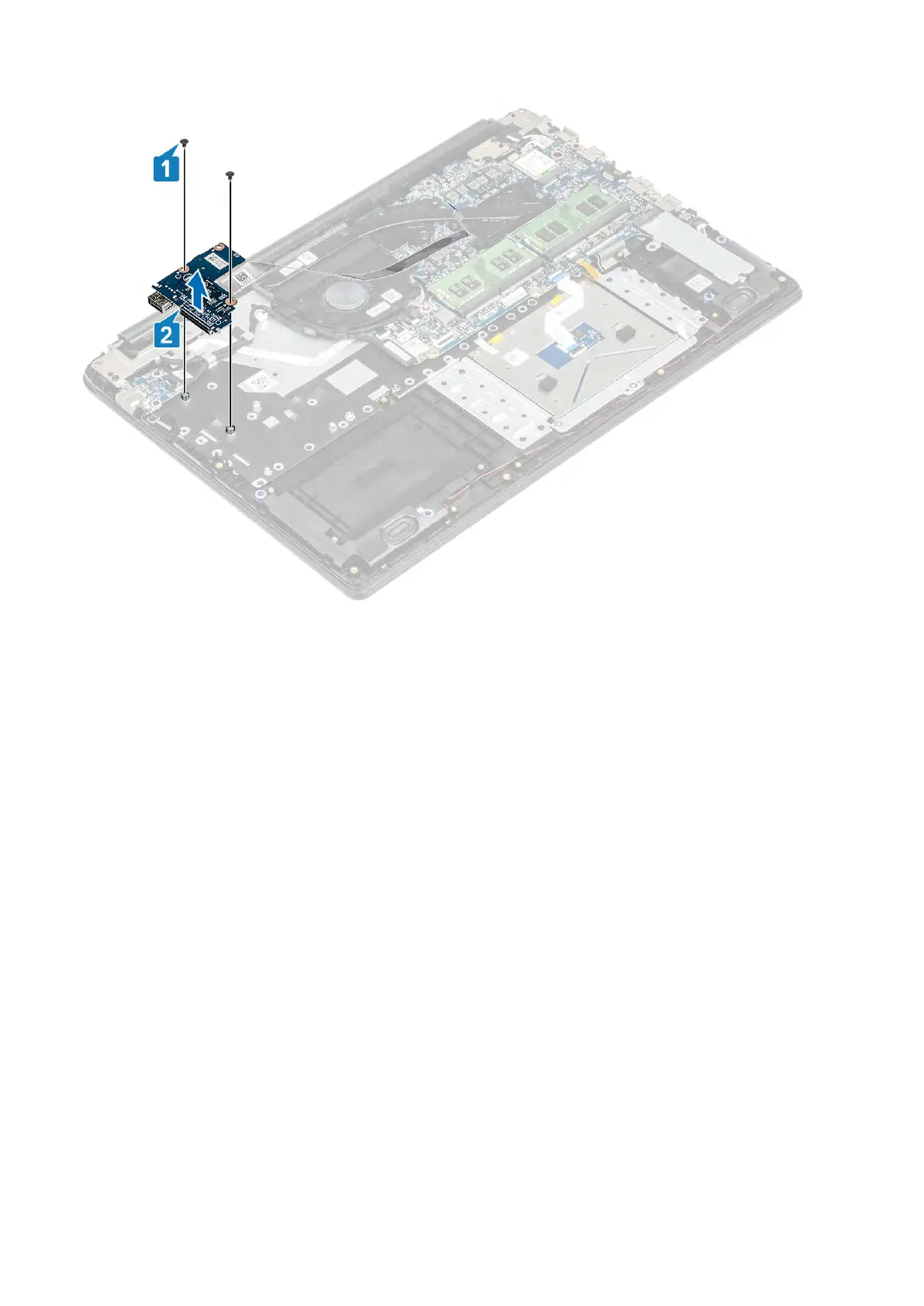 2. Replace the two (M2x3) screws that secure the I/O board to the palm rest and keyboard assembly [2].