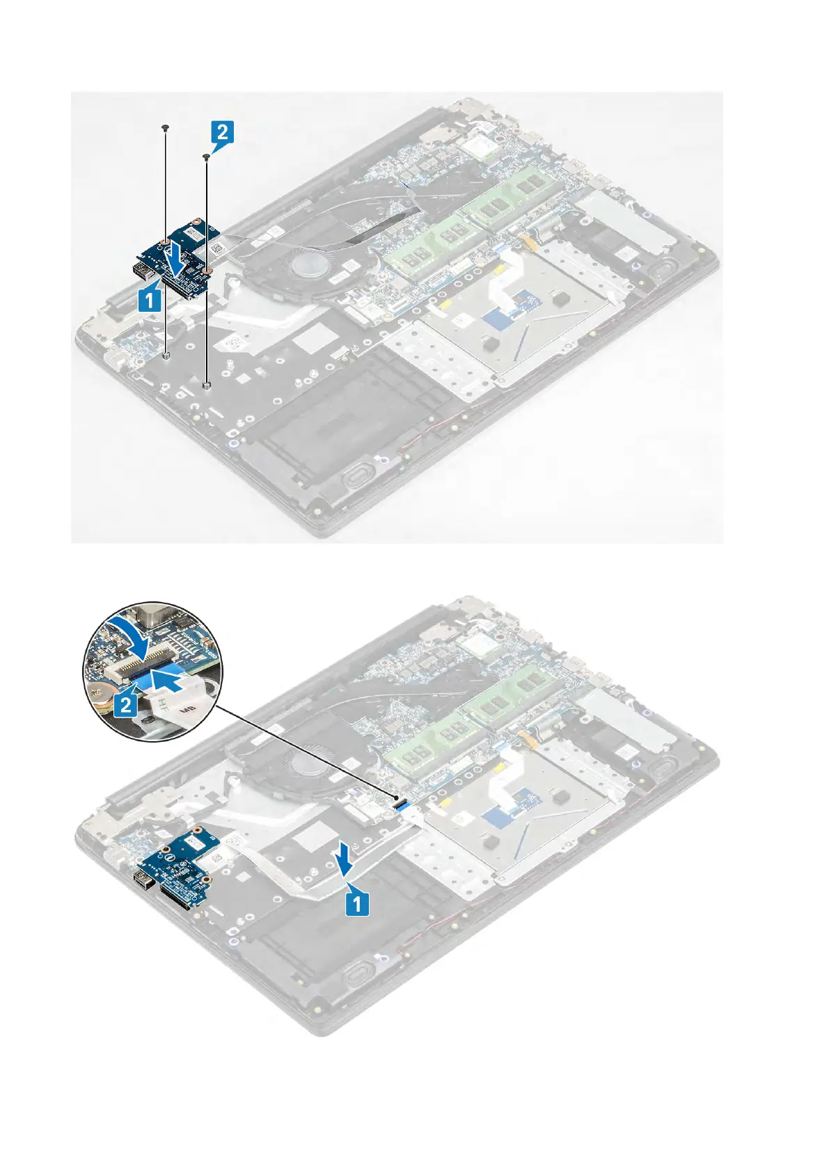 4. Connect the I/O board cable to the system board and close the latch to secure the cable [2].