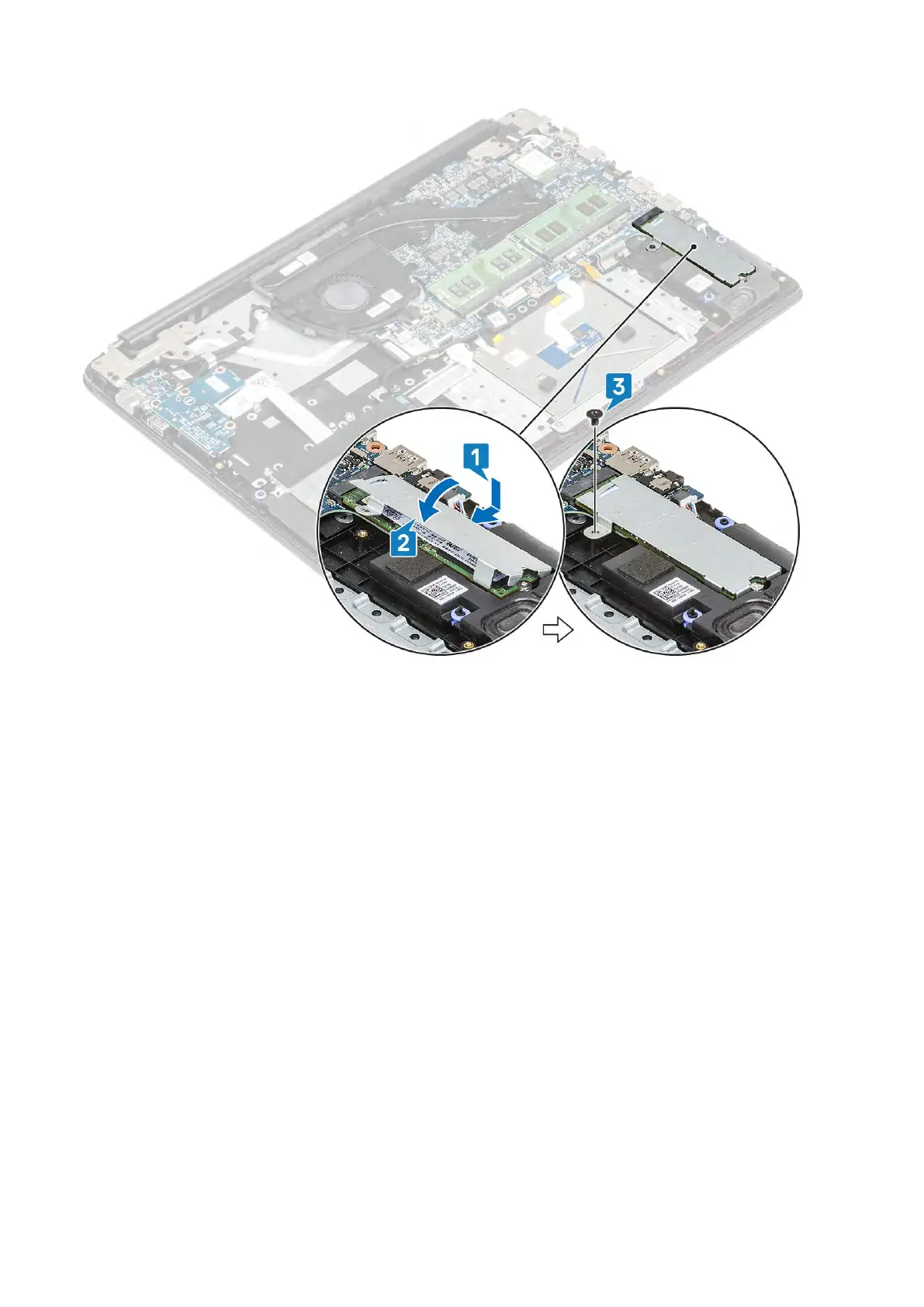 1. Remove the single (M2x3) screw that secures the solid-state drive bracket to the palmrest and keyboard assembly [1].