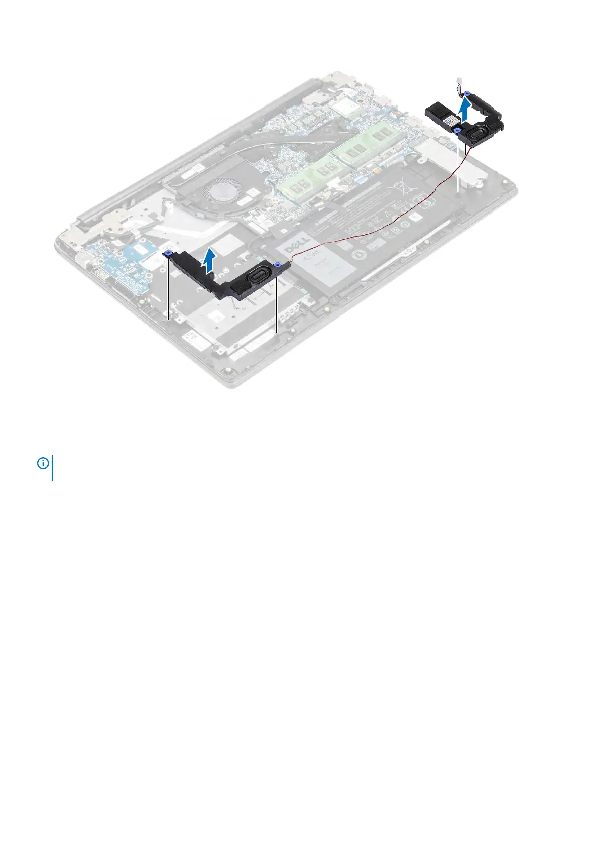 1. Using the alignment posts and rubber grommets, place the speakers in the slots on the palm rest and keyboard assembly.