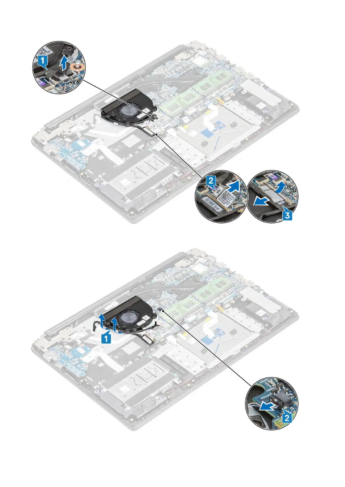 4. Remove the two (M2x3) screws that secure the fan to the palmrest and keyboard board assembly [1].