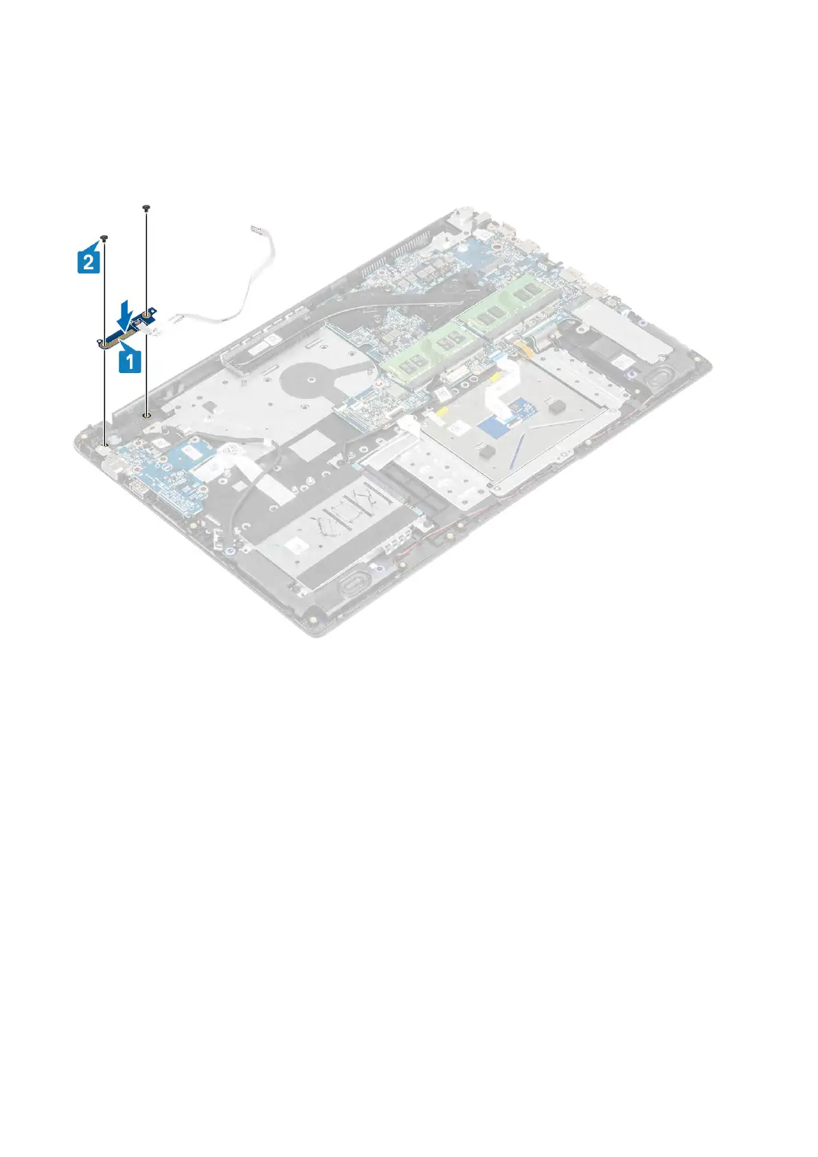 2. Replace the two (M2x3) screws that secure the power button board to the palmrest and keyboard assembly [2].