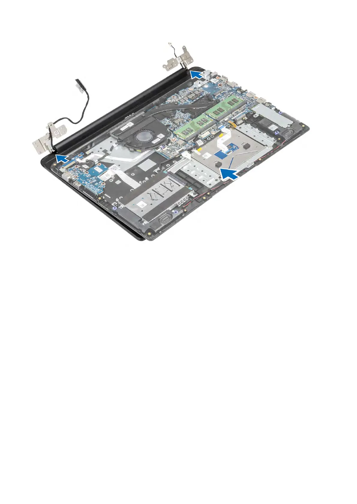 3. Press the hinges down on the system board, and palmrest and keyboard assembly [2].