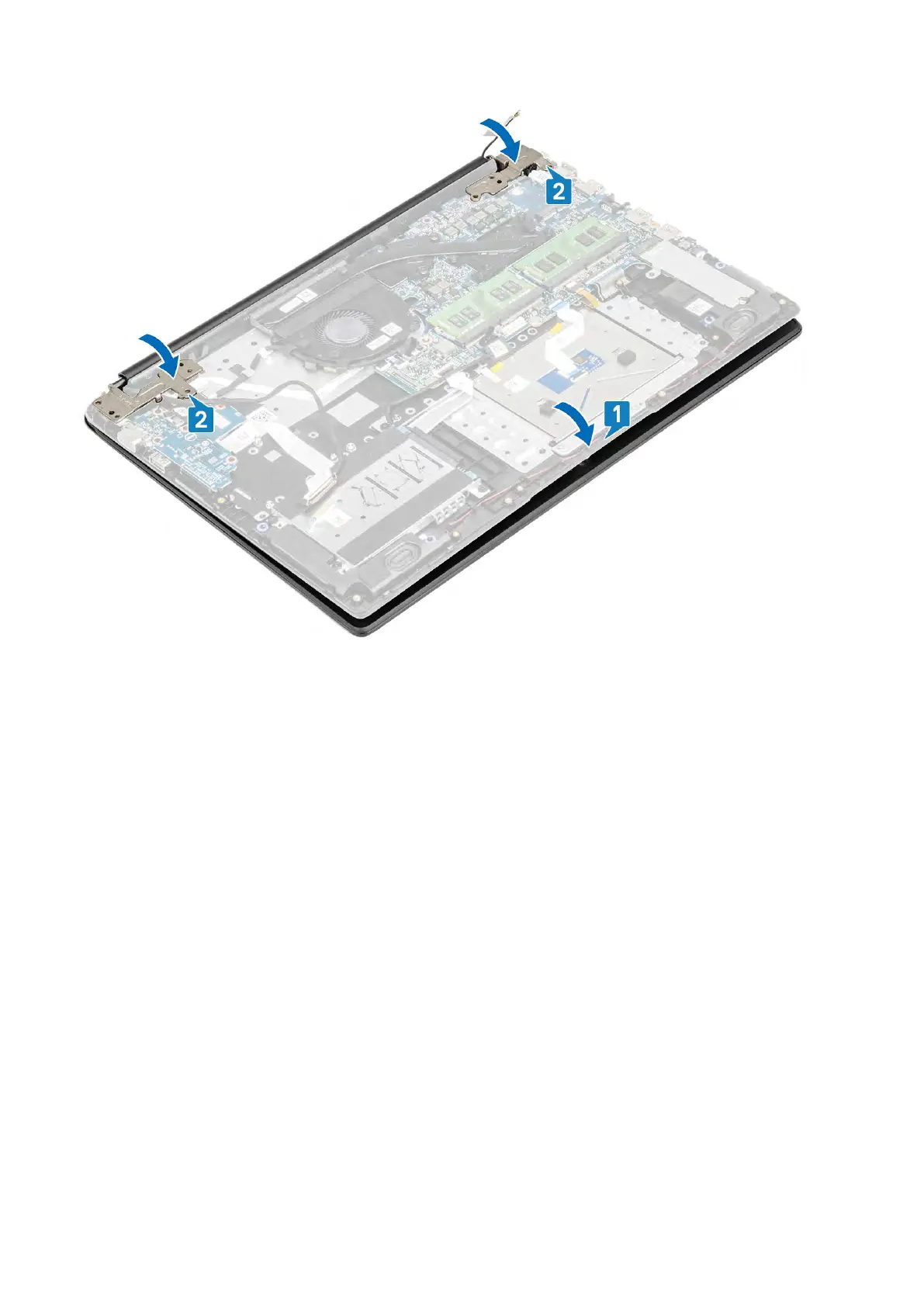 5. Replace the four (M2.5x5) screws that secure the left and right hinges to the system board, and palmrest and keyboard assembly [2].