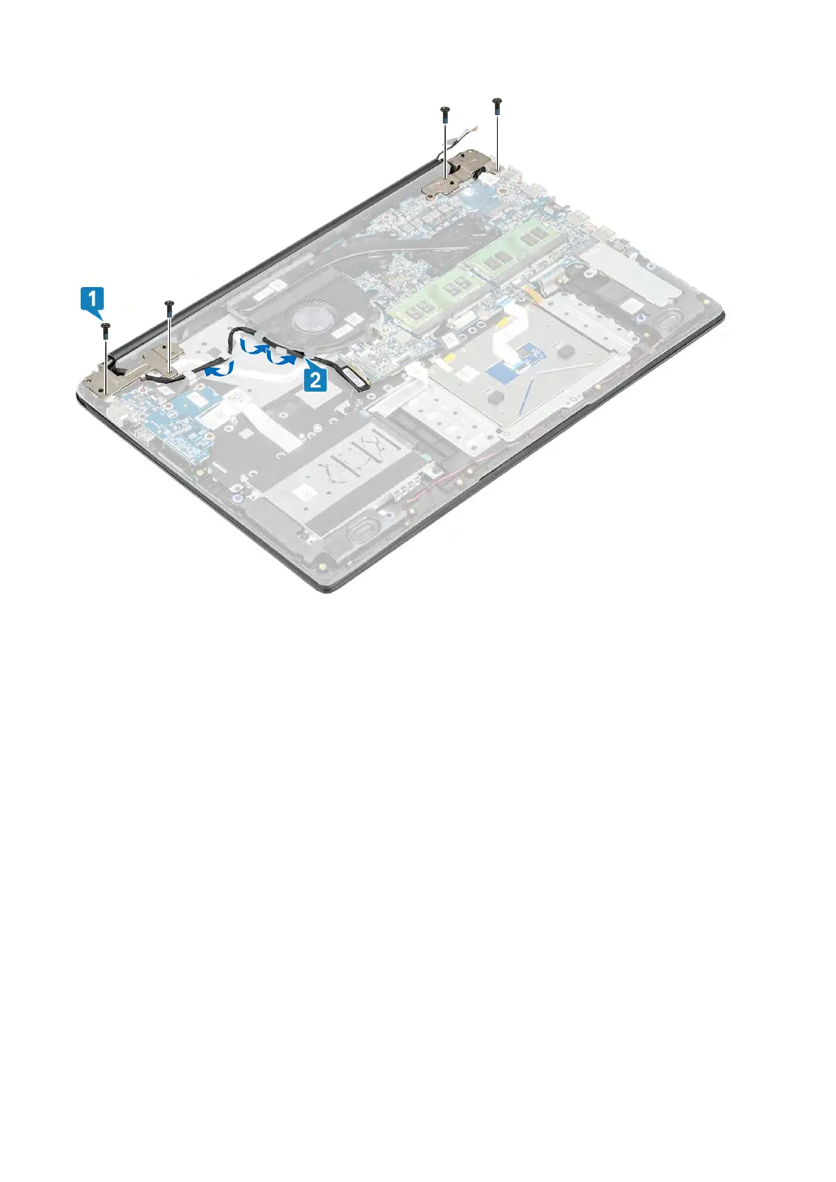 6. Connect the wireless antenna cables and affix the tape that secures it to the system board [1].