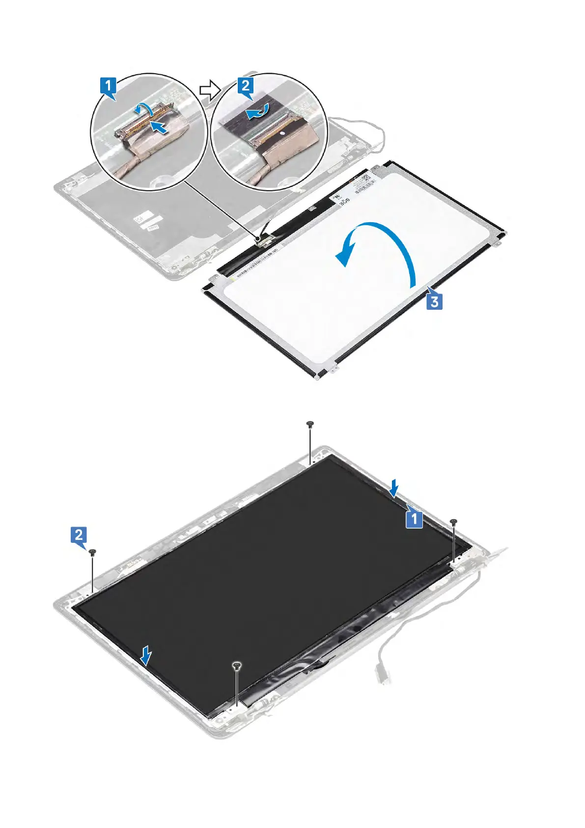 6. Replace the four (M2x2.5) screws that secure the display panel to the display back-cover [2].