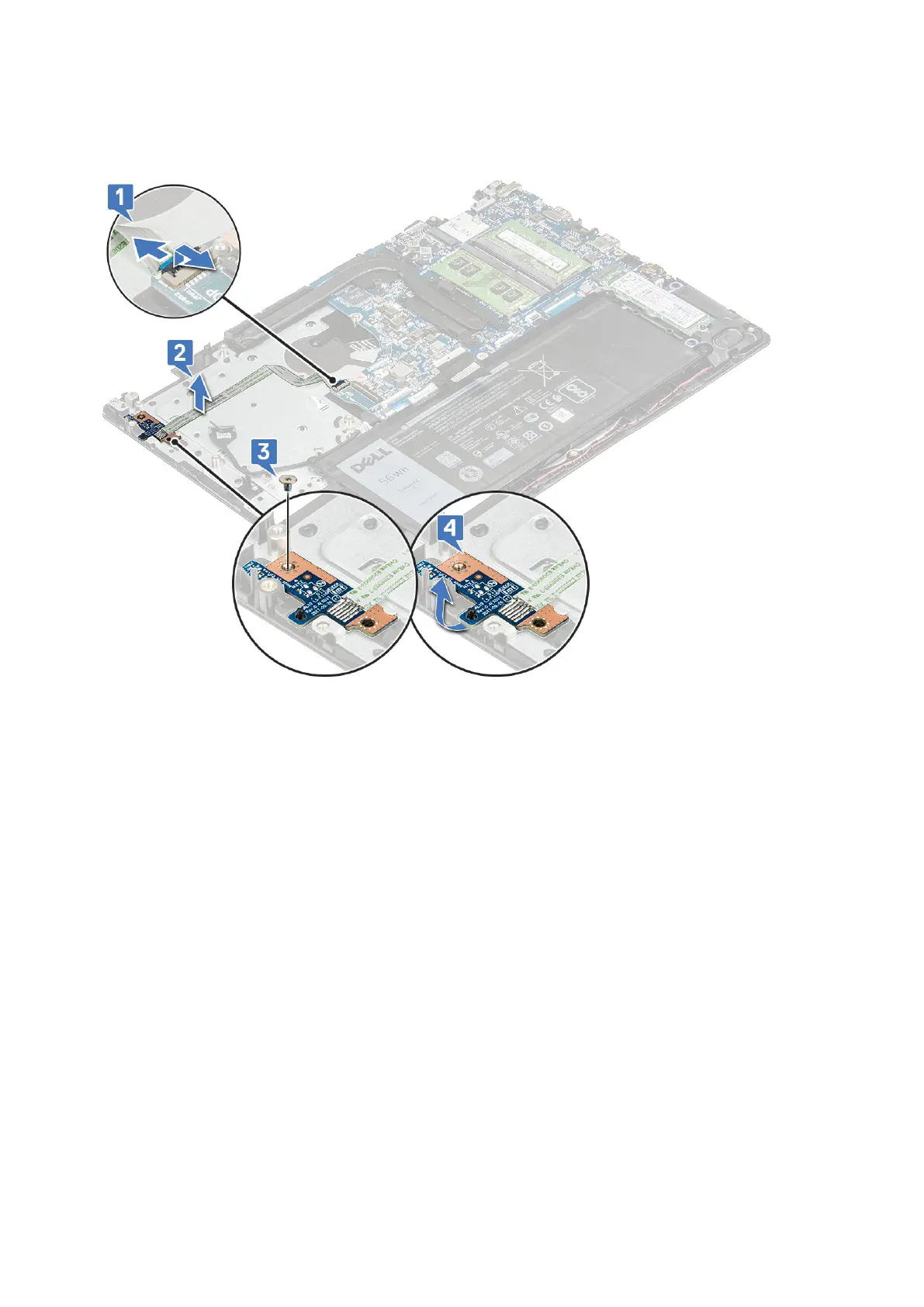 b. Remove the M2x2 screw that secures the power button board to the system [3].