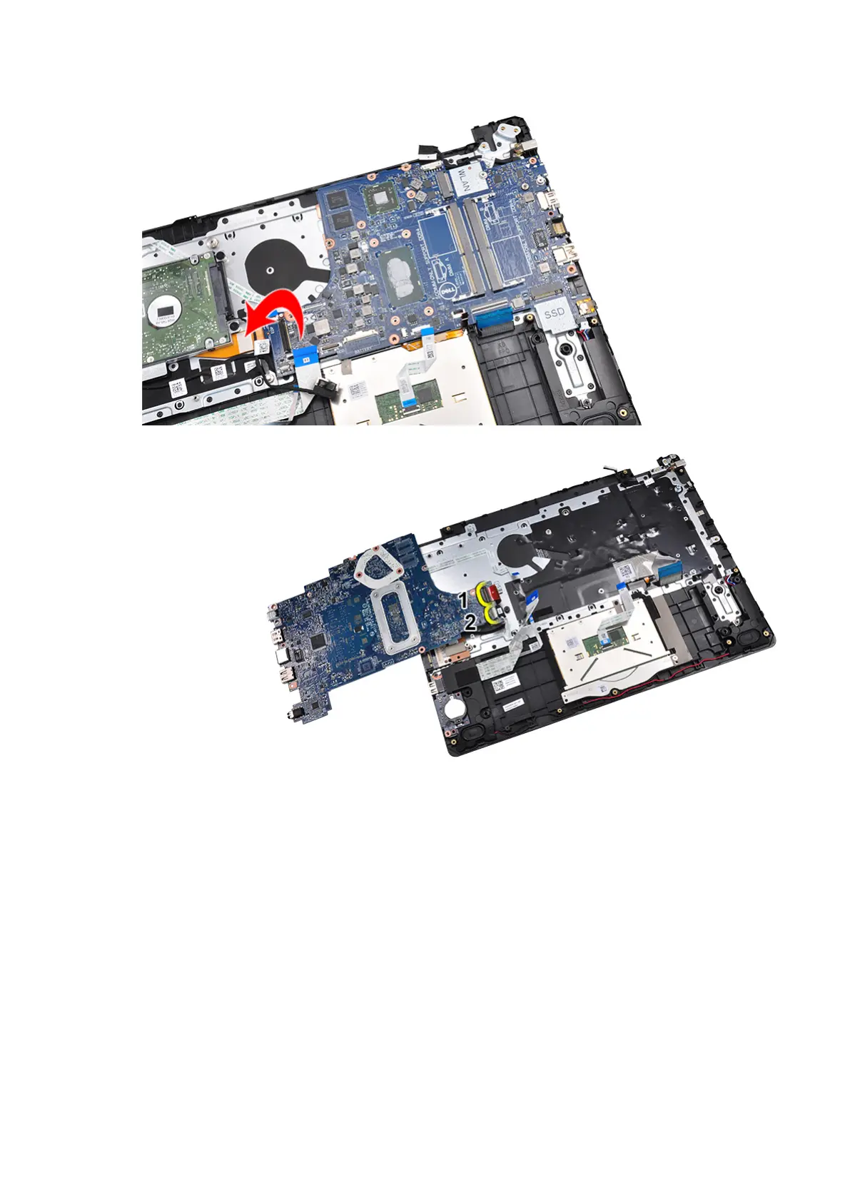 b. Disconnect the WWAN daughter board FPC [1] and VGA daughter board cable [2] from the connectors on the bottom