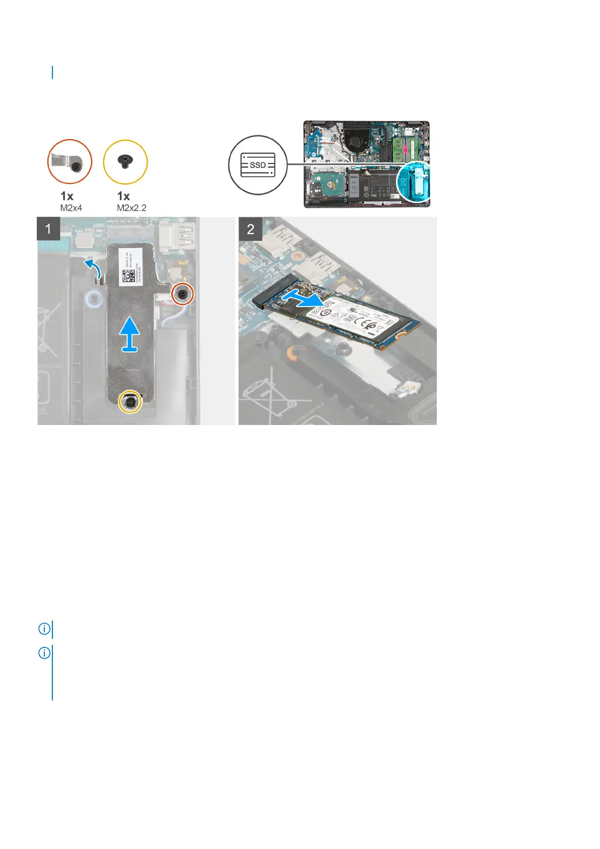 The following images indicate the location of the M.2 2280 solid-state drive and provides a visual representation of the removal