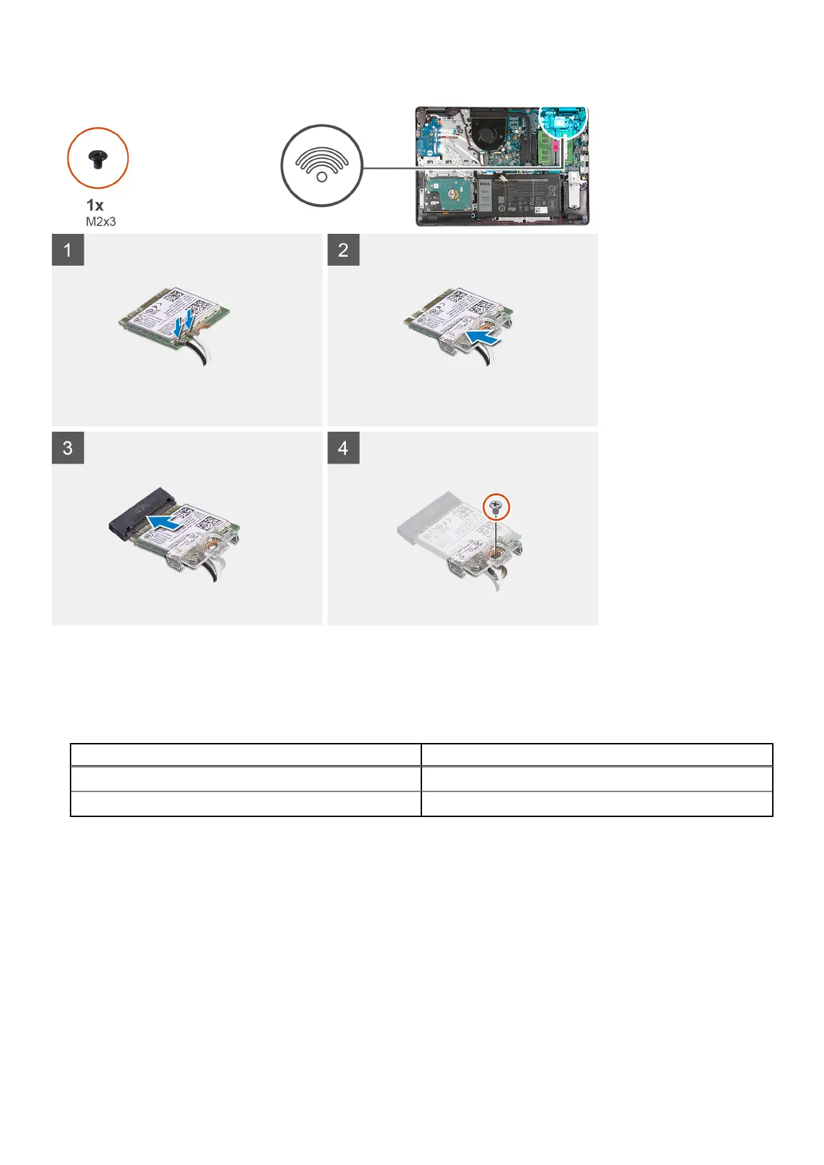 The following table provides the antenna-cable color scheme for the wireless card supported by your computer.