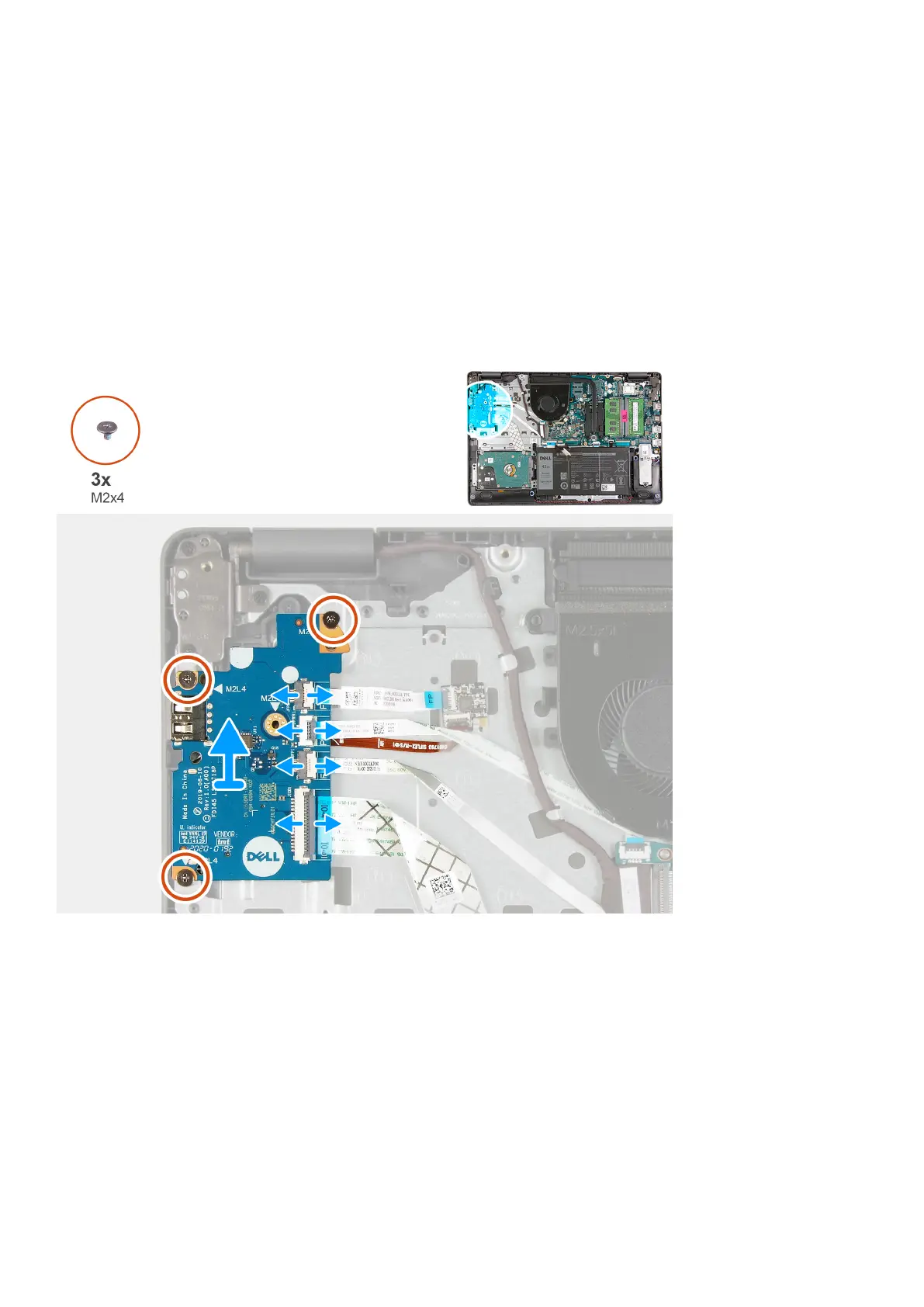 5. Remove the three screws (M2x4) that secure the I/O board to the palm-rest and keyboard assembly.