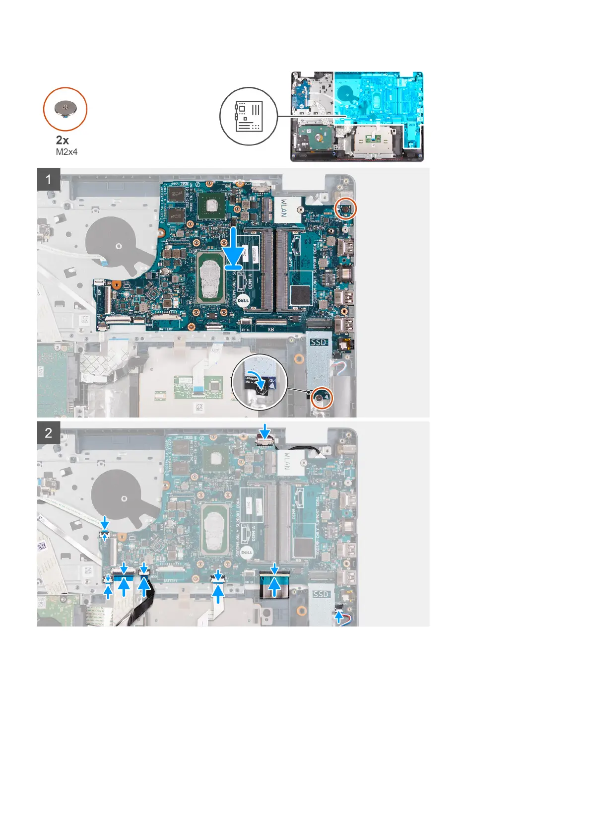 3. Replace the two screws (M2x4) that secure the system board to the palm-rest and keyboard assembly.