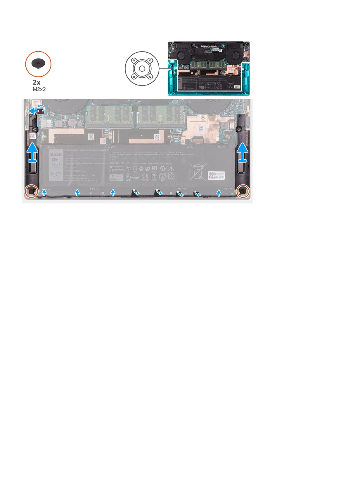 3. Remove the two screws (M2x2) that secure the speakers to the palm-rest and keyboard assembly.