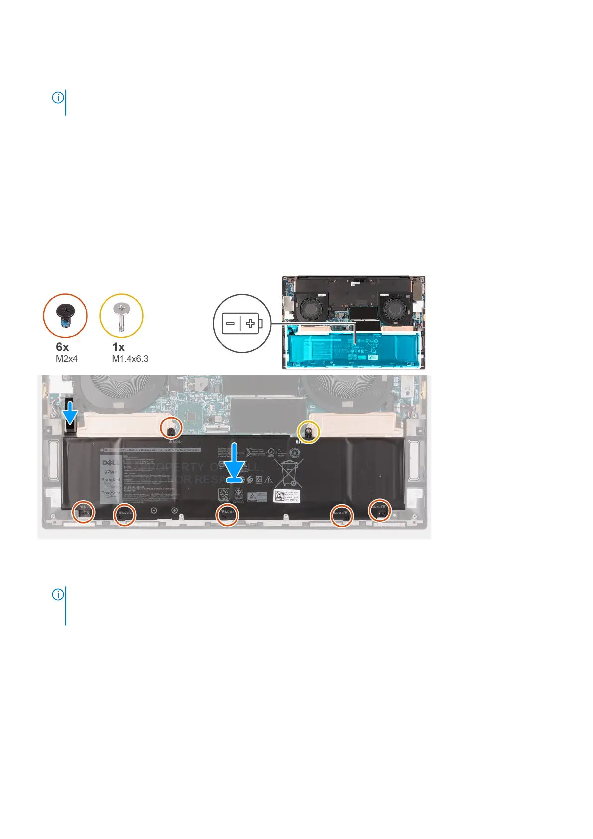 2. Replace the screw (M2x4) and the screw (M1.4x6.3) that secure the top of the battery and the solid-state drive thermal