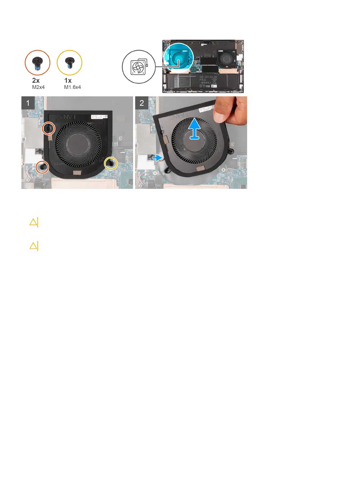 1. Remove the two screws (M2x4) that secure the left fan (FAN2) to the system board and palm-rest and keyboard assembly.
