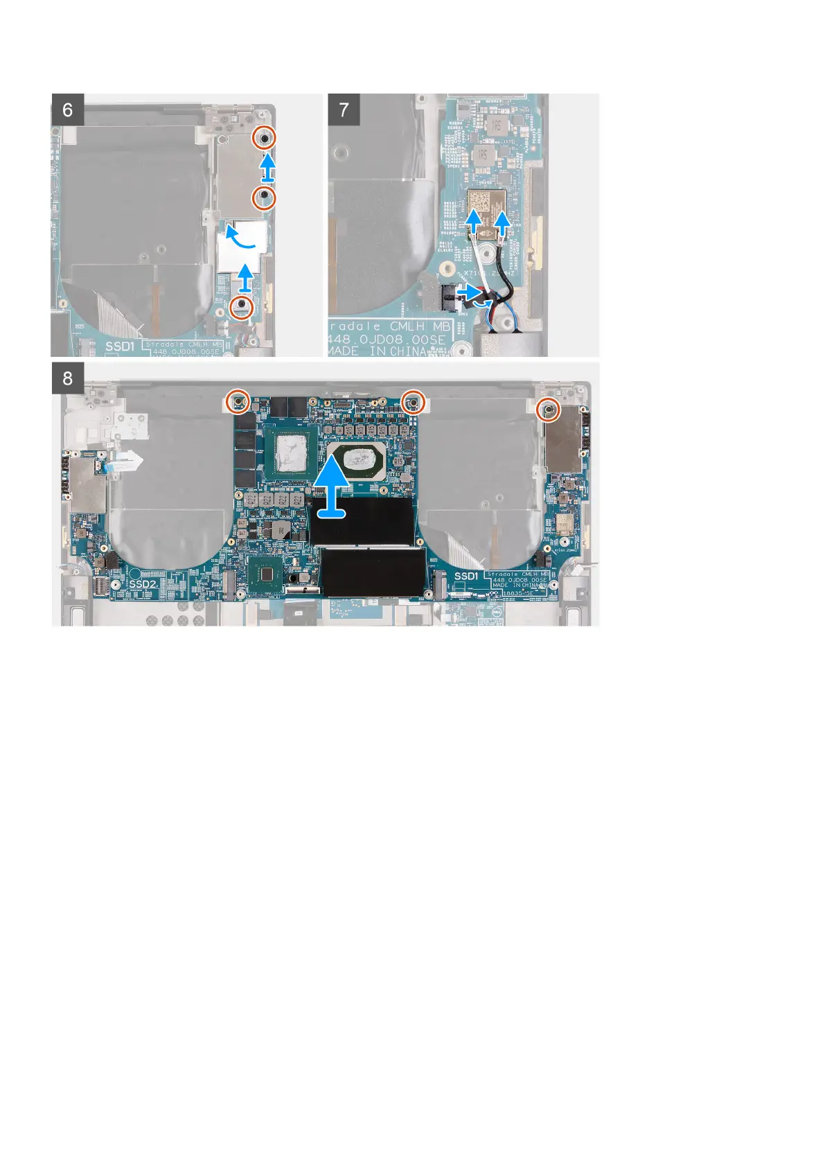 14. Remove the three screws (M2x4) that secure the system board to the palm-rest and keyboard assembly.