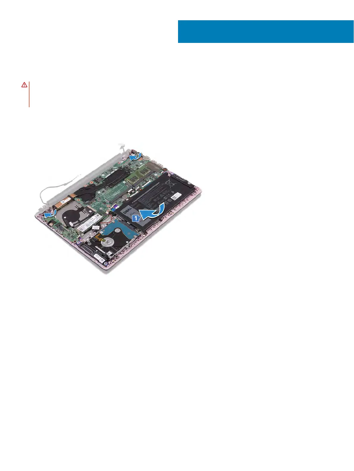 1 Slide the palm-rest and keyboard assembly at an angle under the hinges on the display assembly.