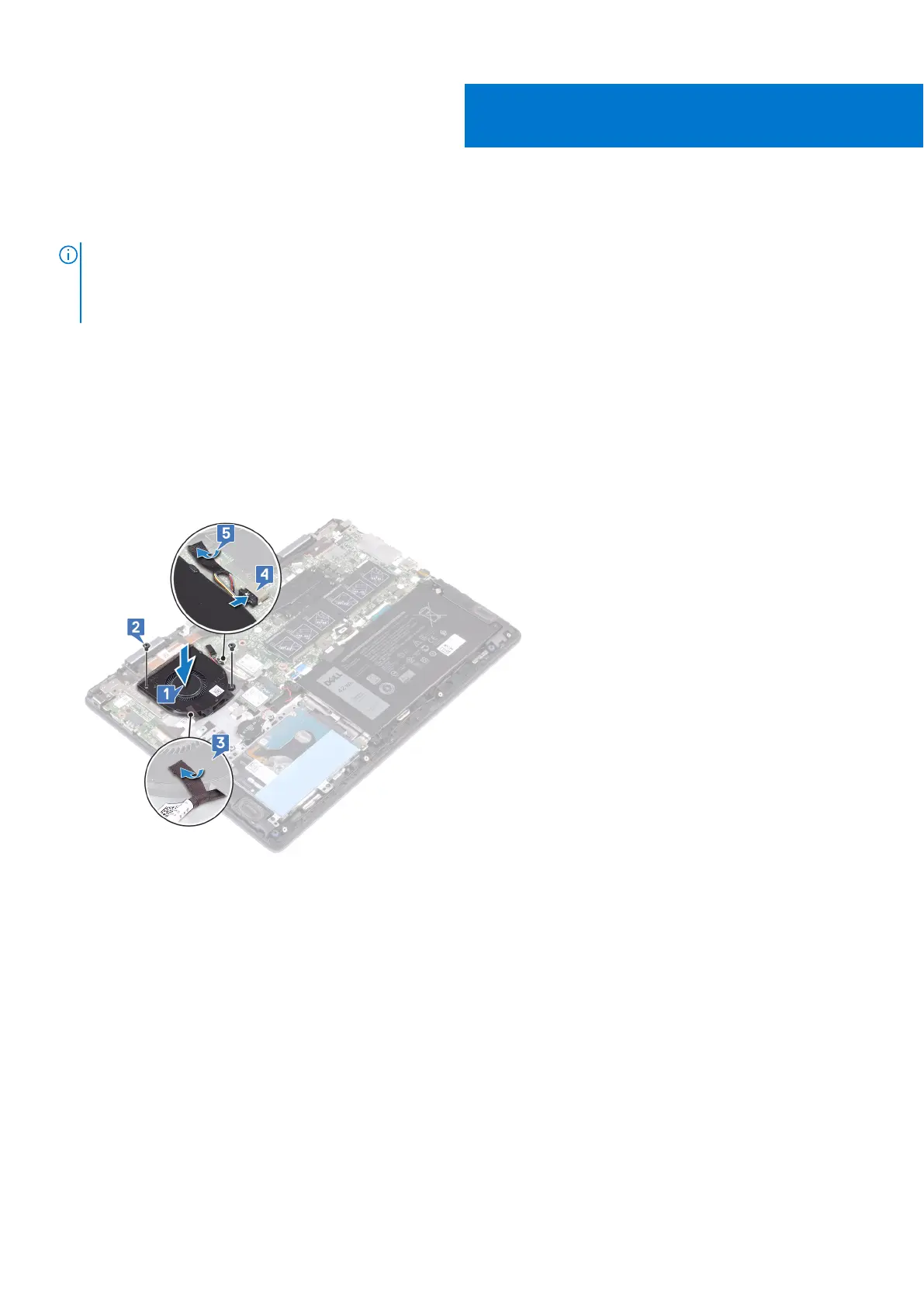 2. Replace the two screws (M2x3) securing the fan to the palm-rest and keyboard assembly.