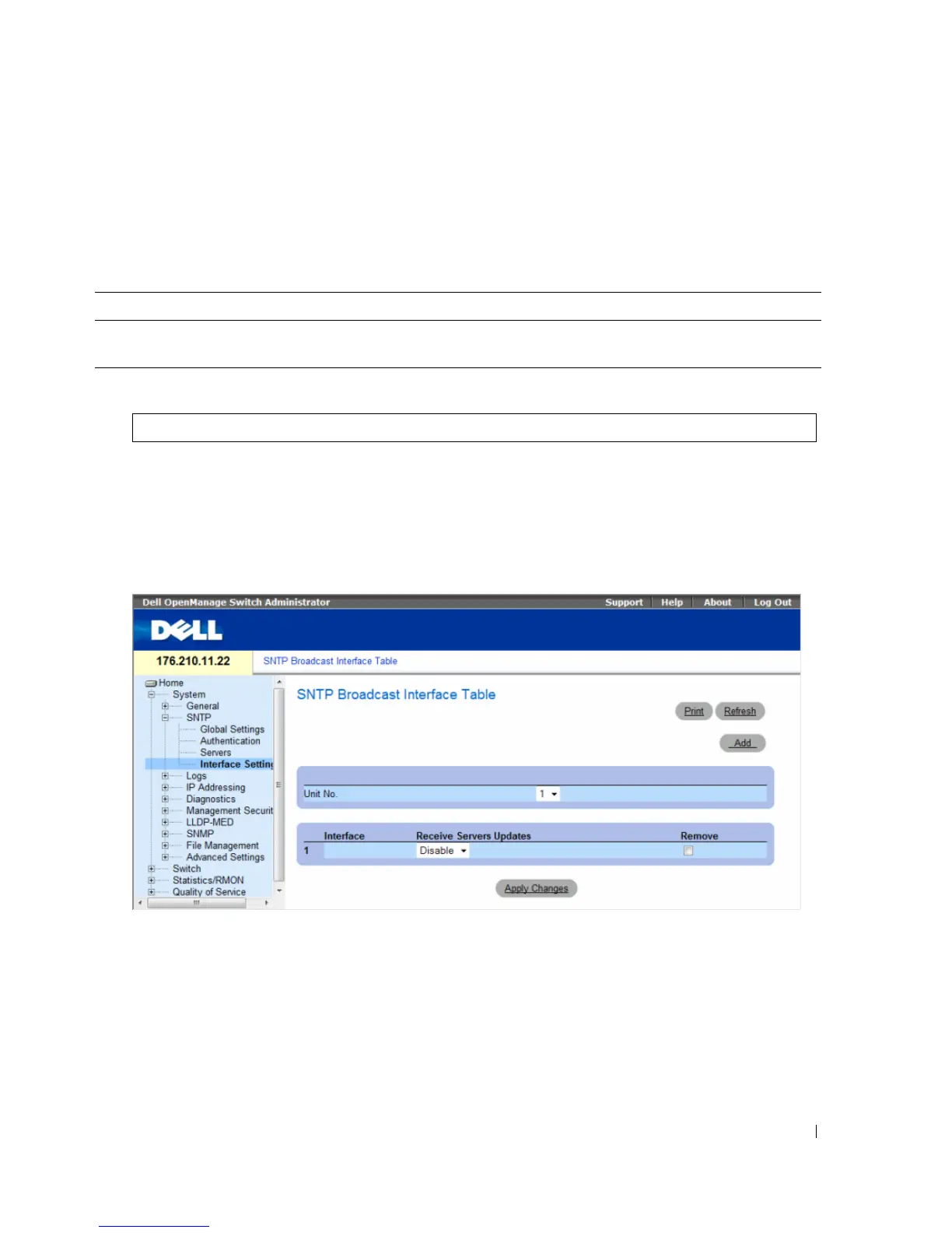 Broadcast Interface Table page, click System → SNTP → Interface Settings.
