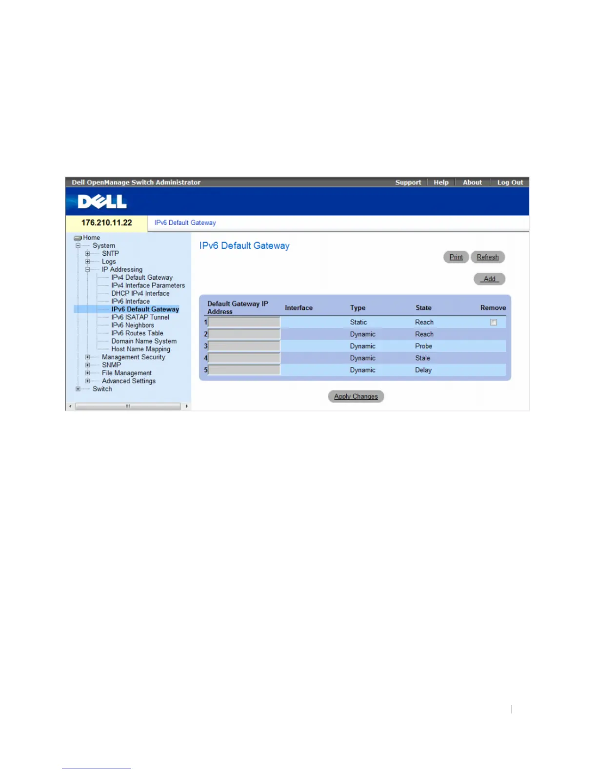 To open the IPv6 Default Gateway page, click System→ IP Addressing→ IPv6 Default Gateway in the