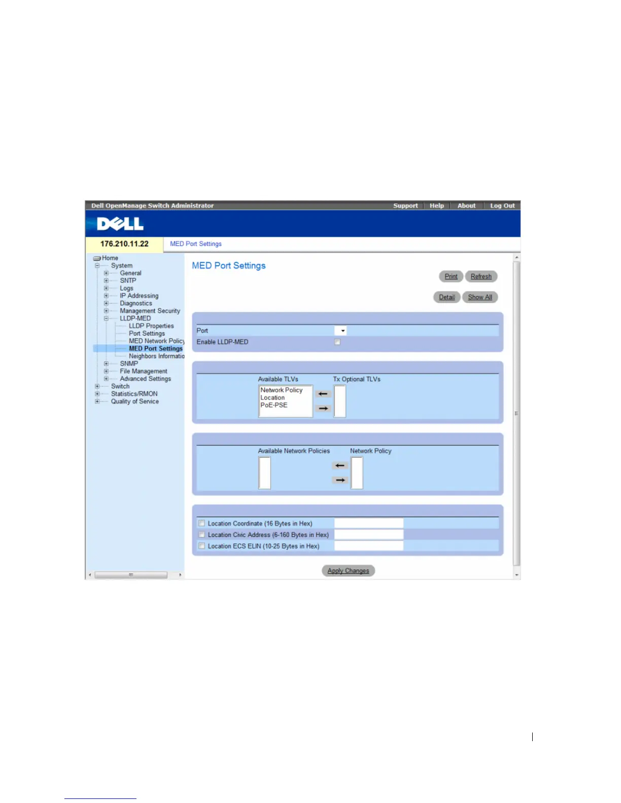 The MED Port Settings contains parameters for assigning LLDP network policies to specific ports.
