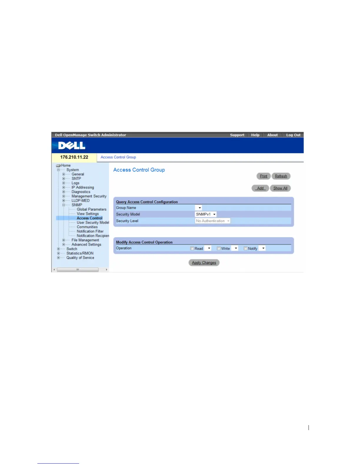 The Access Control page provides information for creating SNMP groups, and assigning SNMP access