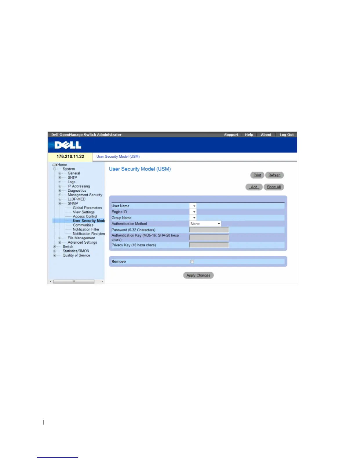 To open the SNMPv3 User Security Model (USM) page, click System → SNMP → User Security Model