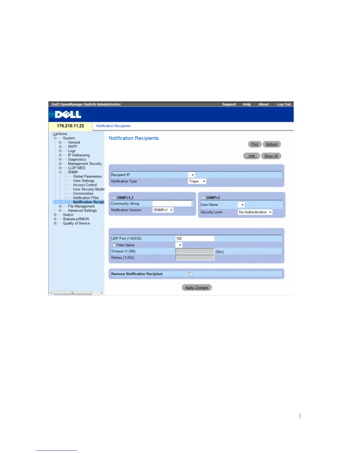 To open the Notification Recipients page, click System → SNMP → Notification Recipient in the tree