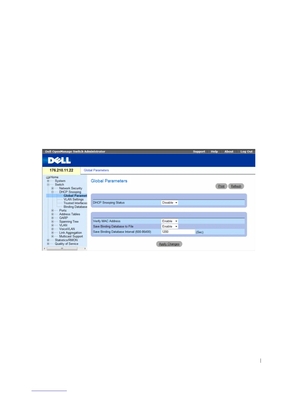 The DHCP Snooping Global Parameters page contains parameters for enabling and configuring DHCP