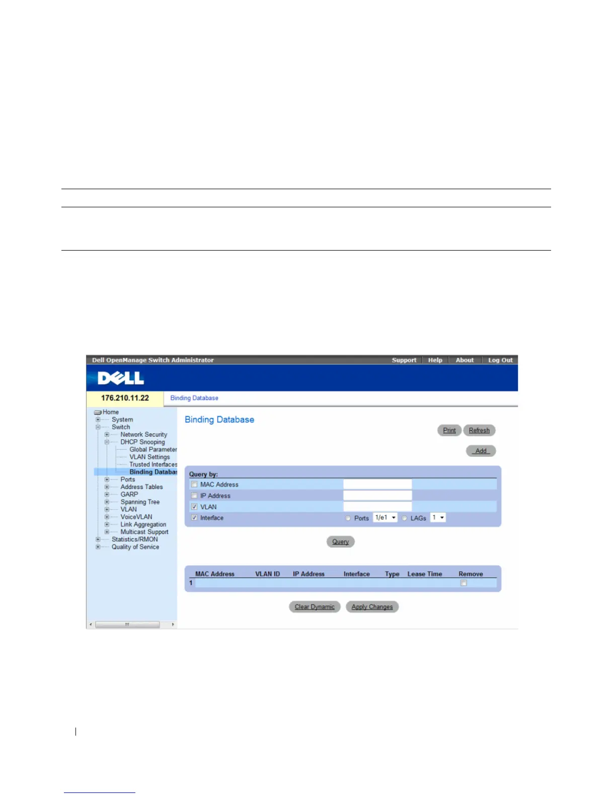 To open the Binding Database page, click Switch→ DHCP Snooping → Binding Database