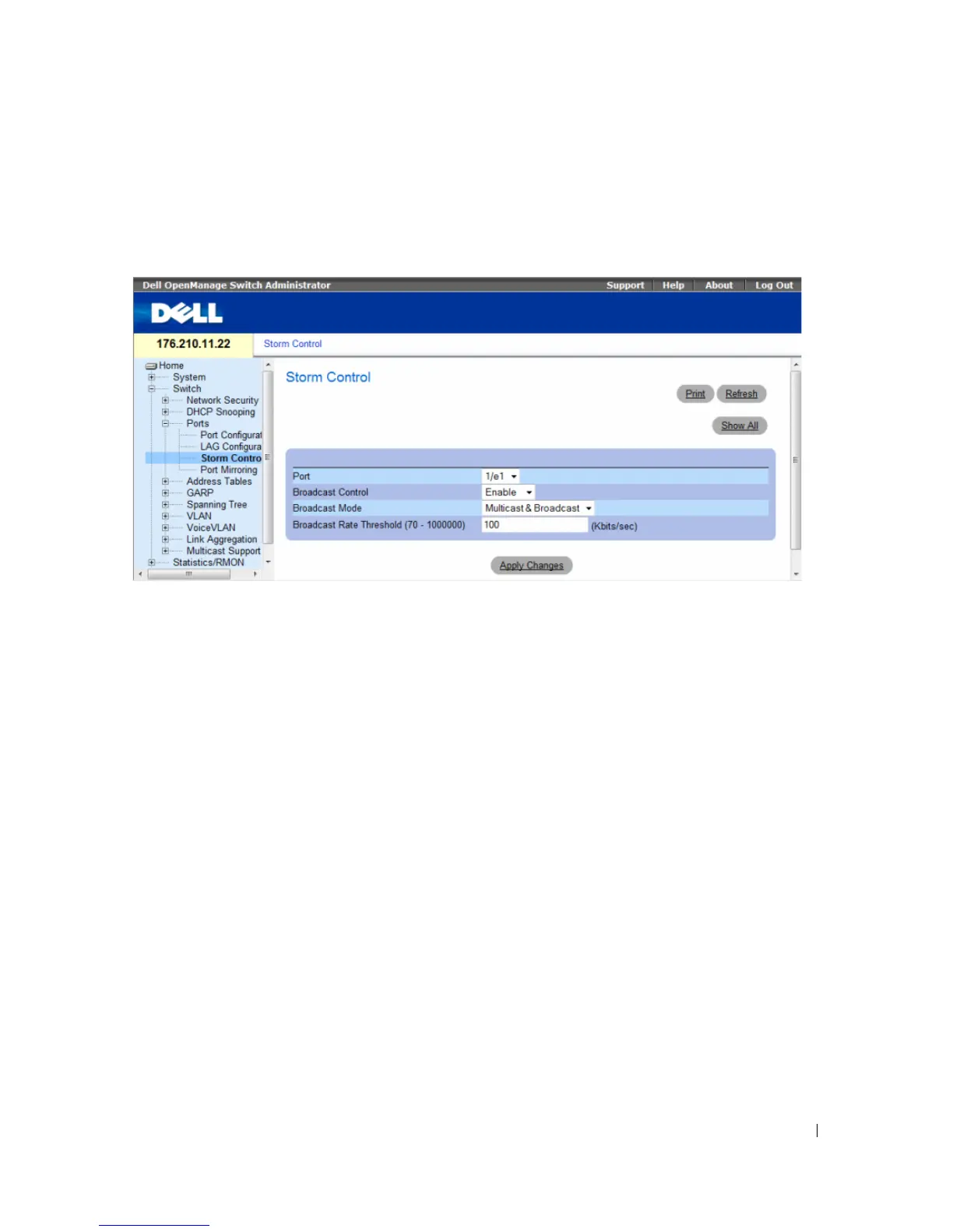 To open the Storm Control page, click Switch → Ports → Storm Control in the tree view.