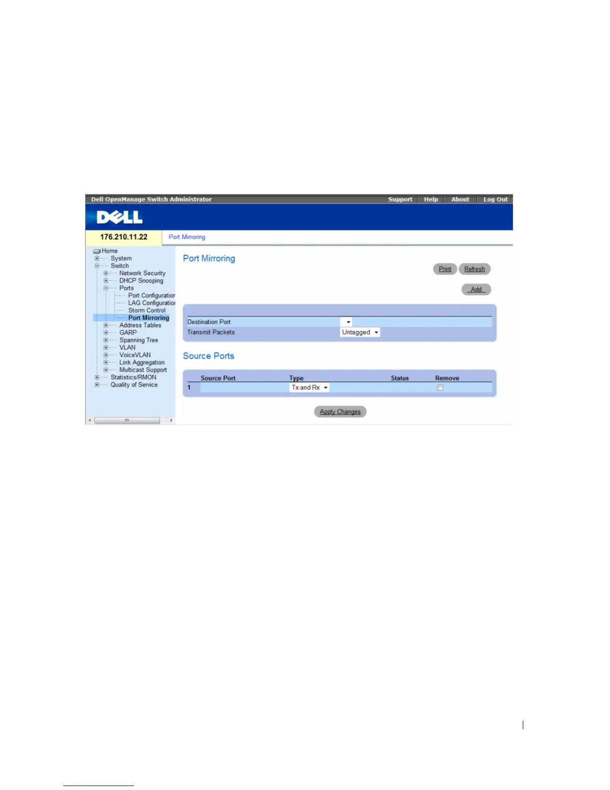 To open the Port Mirroring page, click Switch → Ports → Port Mirroring in the tree view.