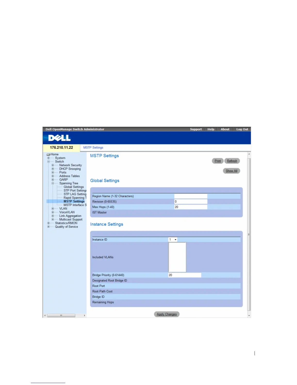 To open the MSTP Settings page, click Switch → Spanning Tree → MSTP Settings in the tree view.