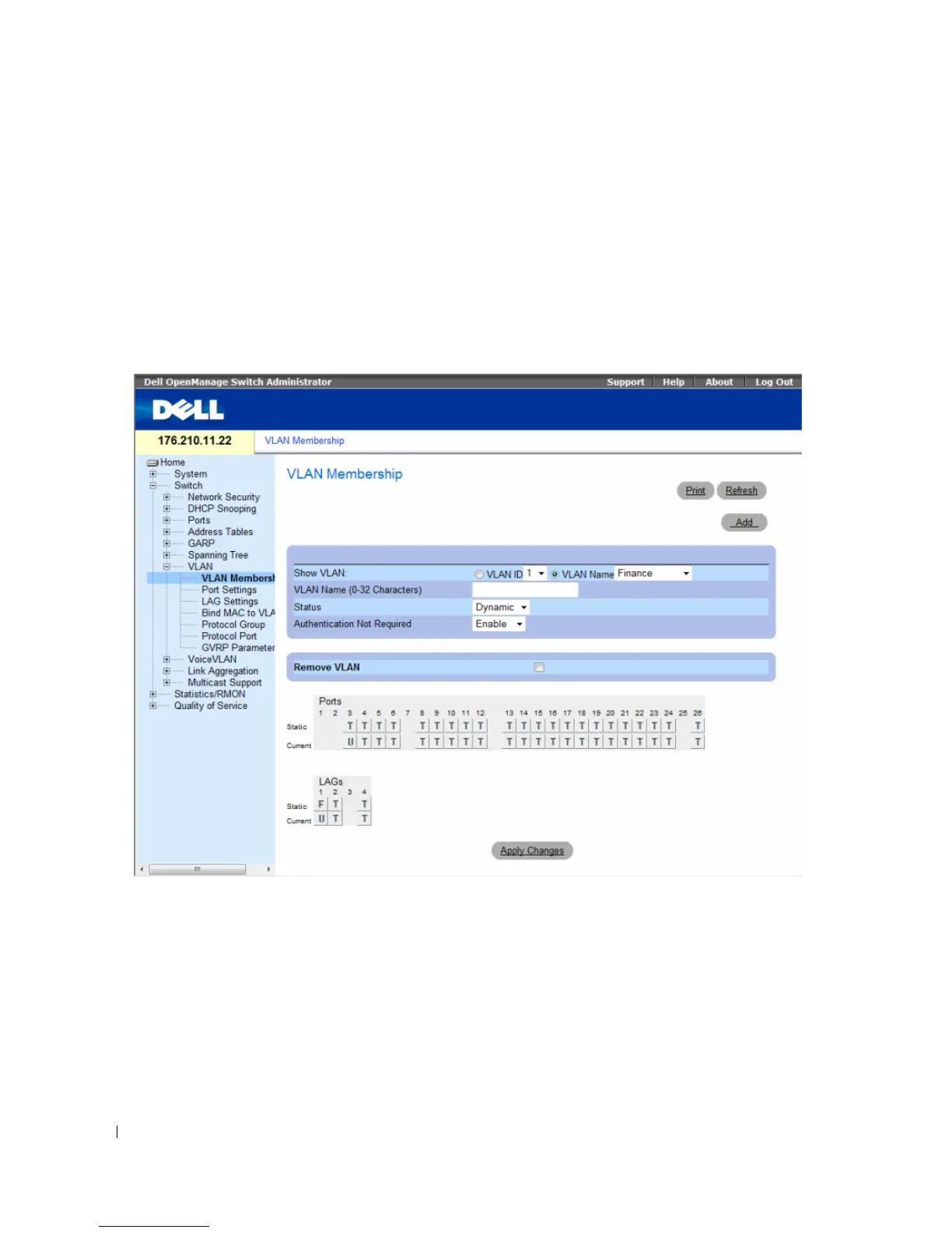 The VLAN Membership page contains fields for defining VLAN groups. The device supports the